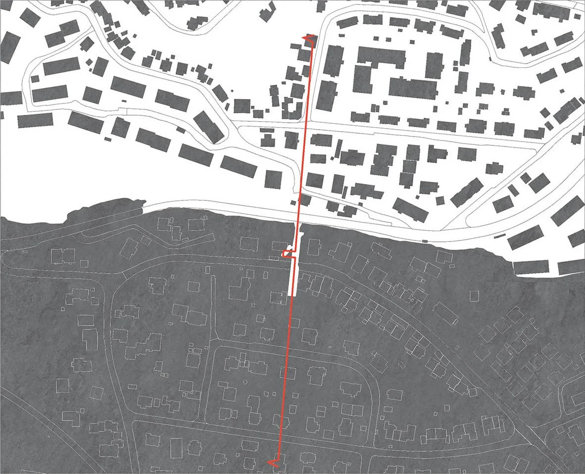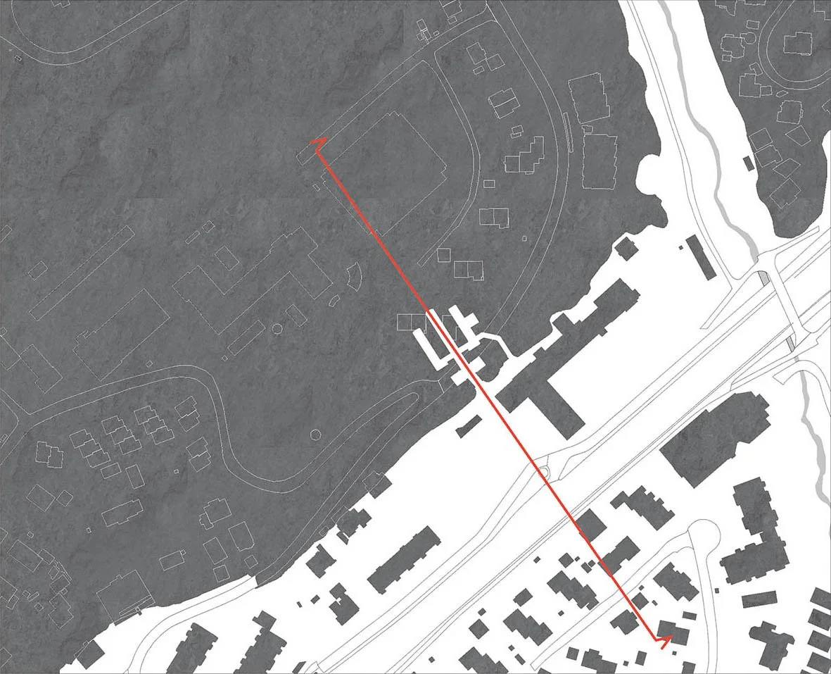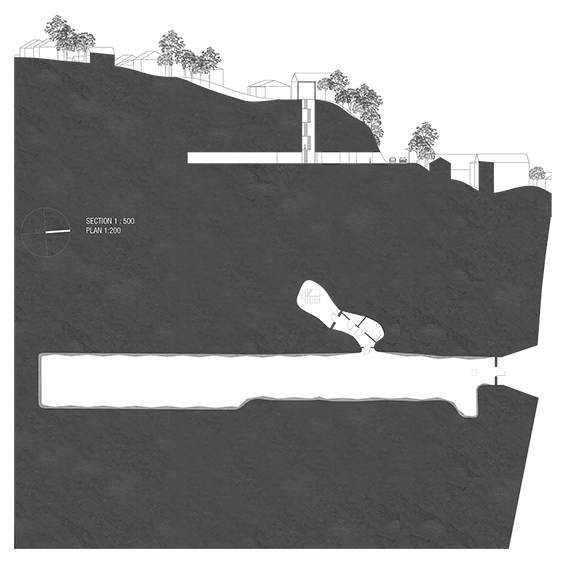 Out of its original context, the site seems misplaced. Brannfjellet alarmplass is located along E6 with a stairwell leading directly to a random private house, connecting the suburbs of Oslo. We propose to take the site for what it is and intervene as less as possible. By embracing its anonymity and the dark cave in itself one can avoid disrupting its existing context.