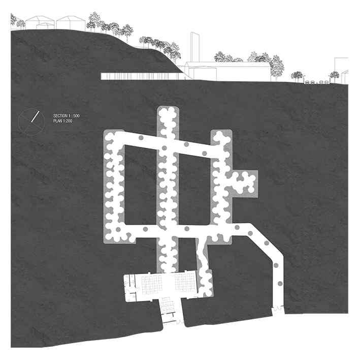 A thorough investigation on graveyard issues of Oslo revealed an ineffectiveness in burial traditions and handling of graveyard property. Contradictory laws pose huge spatial problems for the future and surprisingly enough, a generation very open for change. Another investigation on Oslo´s largest shelters from the cold war, revealed sites without a sustainable strategy for reuse. Oslo municipality are now desperate on to get rid of them, as they rent most of them for free and half of them could pose considerable toxic threat without the necessary renovation. Although these two problems does not correlate, by combining them as site and program, they prove beneficial for each other in terms of reuse, tradition and interpretation of law.