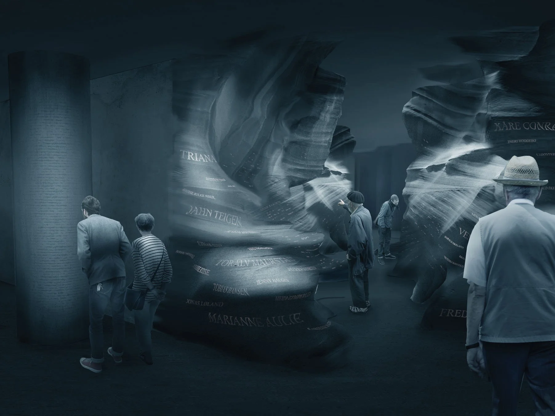 Upon arrival, the visitor is met with a pitch dark cave. It can only be navigated through a control board system. By entering the name of the specific person you are visiting, the exact location of the loved ones will be lit up, creating its own private space. The site is a straight corridor, so the visitors is not disrupted when “following the light”.